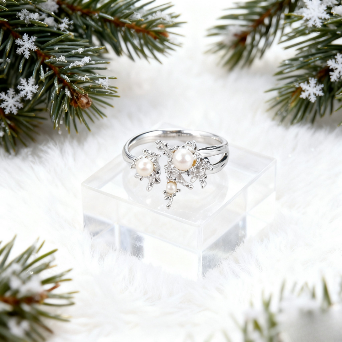 Inspired by the serene beauty of a snow-covered pine forest, this exquisite ring captures the poetic stillness of winter. Crafted from S925 sterling silver and adorned with natural pearls and sparkling zircons, the design evokes delicate snowflakes gently resting on branches. The elegant silver tone complements the soft luster of the pearls, creating a harmonious blend of cool brilliance and natural grace. Its refined silhouette and unique winter theme make it both modern and timeless, perfect for adding a touch of sophistication to any outfit.